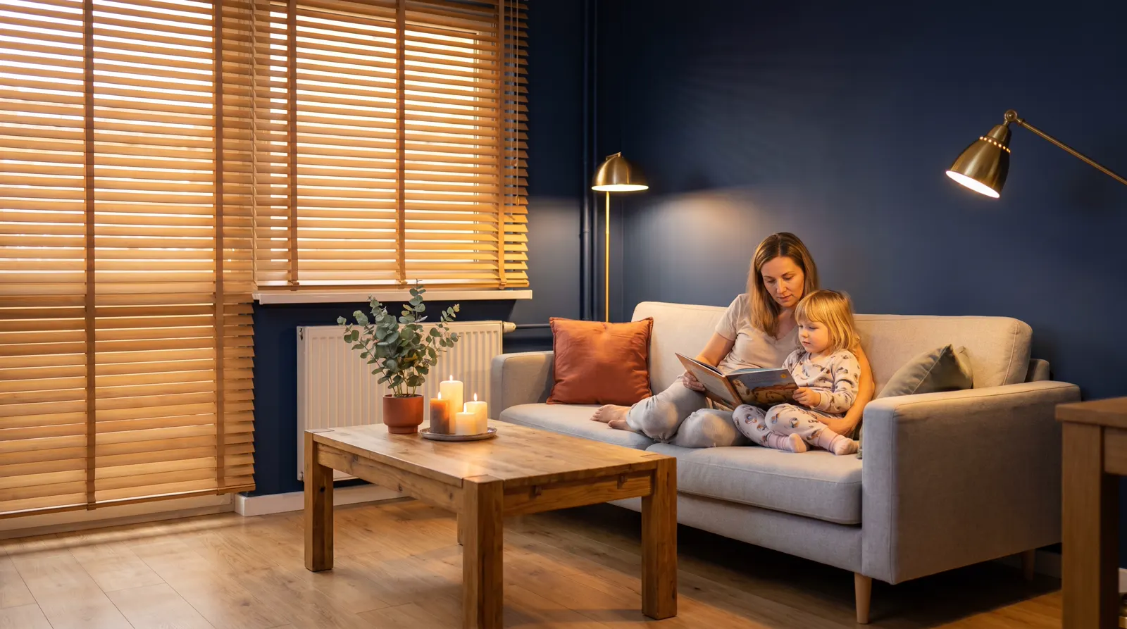 Naturalny dąb 50 mm filtrujący ciepłe światło — domowy klimat hygge w Łodzi.